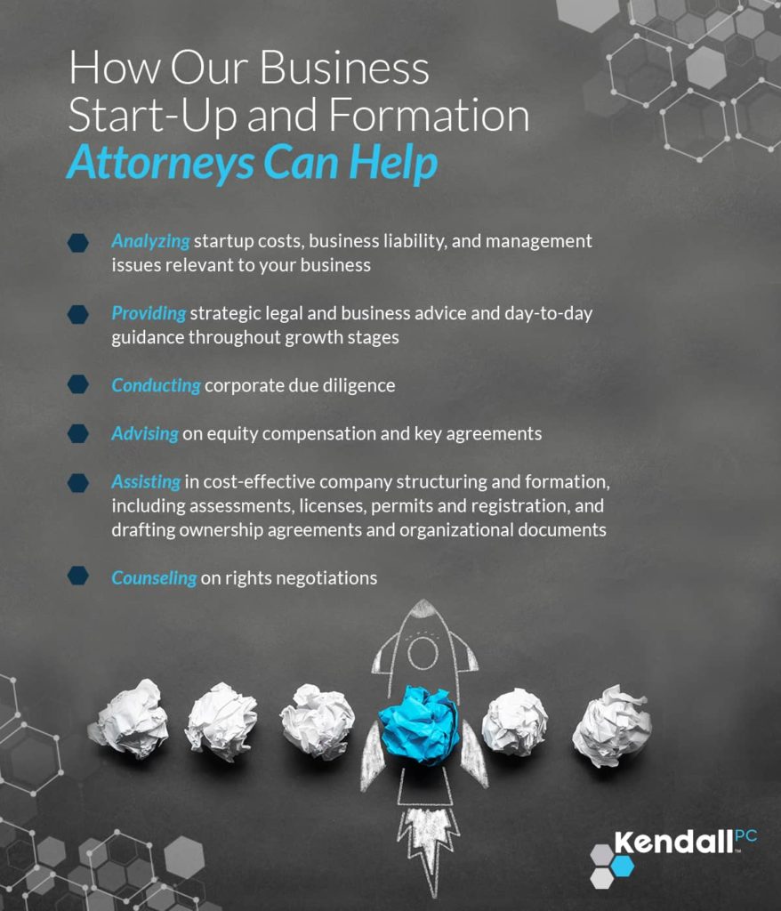 The seasoned business startup and formation attorneys at Kendall PC provide customized legal counsel and guidance to address the critical business and legal issues present in the initial phases of entity formation. Our team works closely with clients to navigate the complexities of entity formation and early growth stages. We advise clients on: